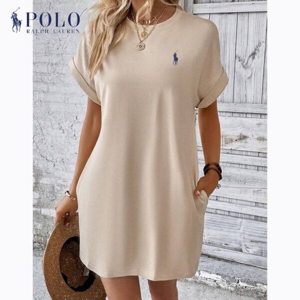Perfect for warm weather or layering, this dress features a classic scoop neckline and short sleeves. The solid color adds versatility—just accessorize and you’re ready to go. Whether you’re heading out for lunch or lounging around the house, the Ralph Lauren – New Elegant Dress is perfect for any occasion.