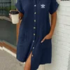 With its loose, contemporary cut that gracefully flatters every silhouette, this dress blends ease with elegance. Thoughtful details—like the classic shirt collar, refined button placket, and a neatly placed chest patch pocket—add a hint of structure while preserving its relaxed, all-day comfort.